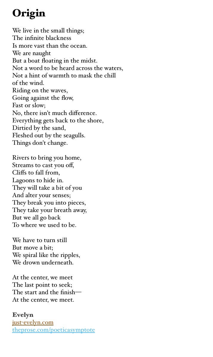 Origins Posted bypoeticasymptoteDecember 9, 2016Posted inFeatured, Free verse, Poem, ReflectionTags:Free verse, just-evelyn.com, life, love poems, math, philosophy, poems, poetry, sad poems, writing Origins. #potd #poem of the day #poetry See this poem and more at theprose.com Share this: Click to email a link to a friend (Opens in new window) Email Click to share on X (Opens in new window) X Click to share on Facebook (Opens in new window) Facebook Click to share on LinkedIn (Opens in new window) LinkedIn Like Loading... Related
